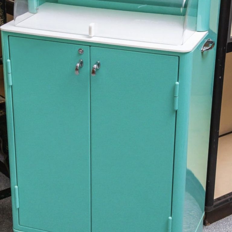 Der Schrank wurde in einer Fachwerkstatt aufwendig restauriert und mit einer neuen Lackierung versehen. Die hochwertige Aufarbeitung verleiht dem Möbelstück sowohl einen frischen Look als auch den nötigen Schutz für den weiteren Gebrauch – ideal als Design-Highlight im Wohnbereich, Loft oder Showroom.