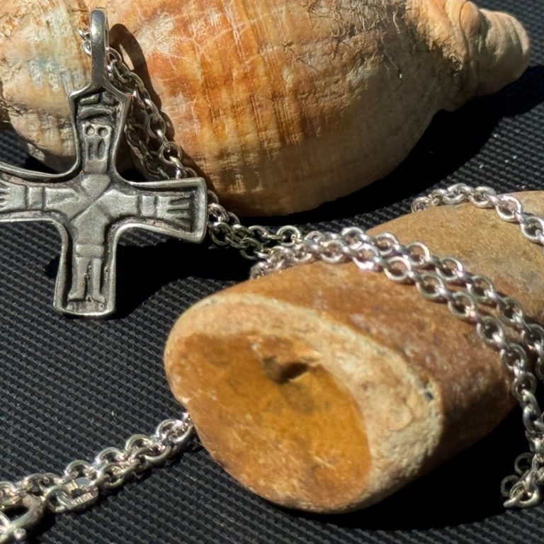 In den Tiefen der Erde, im Rauschen der Wellen oder auf langen Wanderungen durch die Natur begegnen uns Spuren einer anderen Zeit. Was einst Knochen war, wurde zu Stein. Was einst Glaube war, wurde zu Silber. Unsere Kreuze und Ketten erzählen keine Geschichten aus der Massenproduktion, sondern von Entdeckungen, von der Ruhe des Findens und der Kraft des Einfachen.